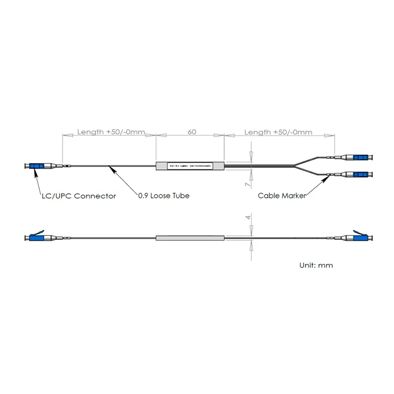 1 × 2 PLC Splitter Steel Tube Package 60 × 7 × 4 مم ، مع موصل أنبوب فضفاض 900 ميكرومتر 1.0 م ، LC/UPC.
