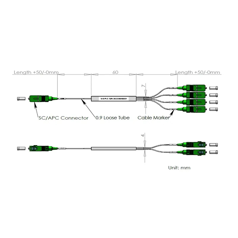 1 × 6 PLC Splitter Steel Tube Package 60 × 7 × 4 مم ، مع أنبوب فضفاض 900μm 1.0 +0.05/-0M ، موصل SC/APC.